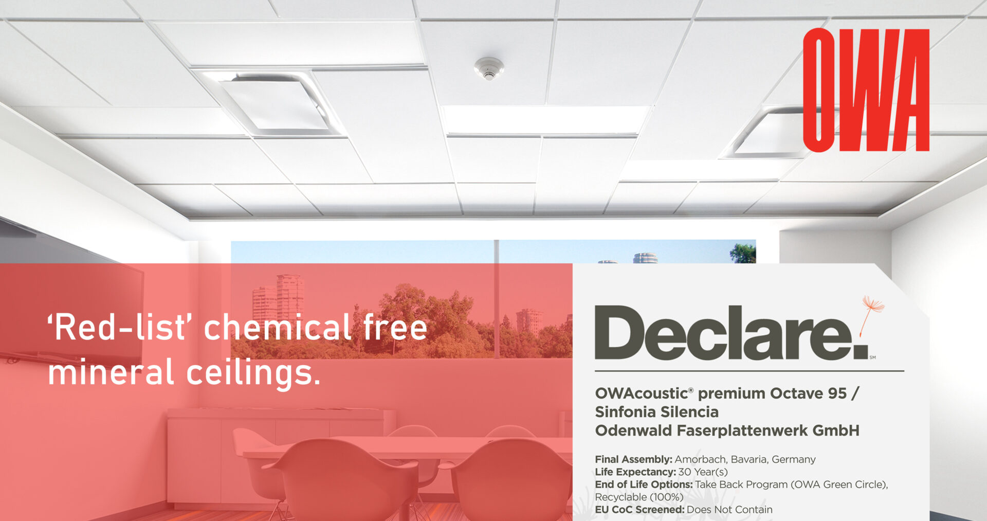 OWA Sinfonia and Sinfonia Silencia are now Declare certified. Declare is essentially an ingredients list for building products, similar to food labelling, designed to form a greener and healthier environment for workers and customers. Based on transparent declarations by manufacturers, where harmful ingredients are disclosed, products that are entirely ‘Red-list’ free may be awarded Declare certification, ensuring they do not pollute the environment and are not harmful.