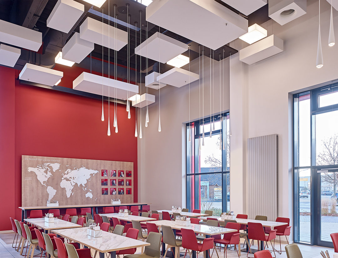 The product “Corpus”, designed by star designer and architect Hadi Teherani for OWA, is evidence that ceiling canopies can be decisive style elements for successful interior design. There is good reason why the cubic acoustic elements from Amorbach, Germany have been awarded several internationally renowned design prizes. The square and rectangular ceiling elements are now used in the company restaurants of Beckhoff Automation GmbH & Co. KG, a manufacturer of automation technology based in Verl in Eastern Westphalia, Germany. They provide impressive lighting highlights and pleasant room acoustics.