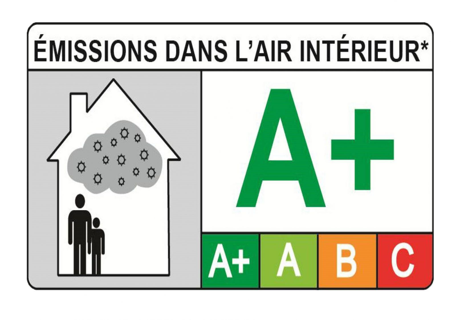 *Information sur le niveau d’émission de substances volatiles dans l’air intérieur, présentant un risque de toxicité par inhalation, sur une échelle de classe allant de A+ (très faibles émissions) à C (fortes émissions).
