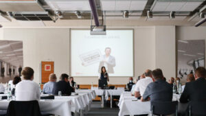 Nach Begrüßung der Teilnehmenden durch Maximilian von Funck stellte Hubertus Kertelge, Leiter Vertrieb DACH bei der Odenwald Faserplattenwerk GmbH, aktuelle Produkt-Innovationen vor. Hierzu zählten die OWActive Mineralklimadecke und die neue Hygienedecken-Generation Humancare.