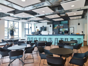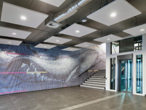 Die Eingangshalle und die Kantine erhalten durch die Selecta Deckensegel (αw = 1,00) ein angenehmes akustisches Klima und ein modernes Design. Der Nachhall in den Treppenhäusern und verschiedenen Multifunktionsräumen wird dank der Produktlinie Sinfonia aus der OWAlifetime collection wirkungsvoll reduziert. Die Systemlösung sorgt für eine angenehme Raumakustik (αw = 0,90). Für eine optimale Sprachverständlichkeit und ein schlichtes, elegantes Erscheinungsbild in den Großraumbüros ist die Mineraldecke Brillianto A verbaut. Diese vlieskaschierte Unterdecke bietet Besuchenden und Mitarbeitenden dank maximaler Absorptionsleistung eine optimale Sprachverständlichkeit und rundet die Akustik für ein gesamtheitliches Wohlbefinden im Schwimmzentrum gekonnt ab.