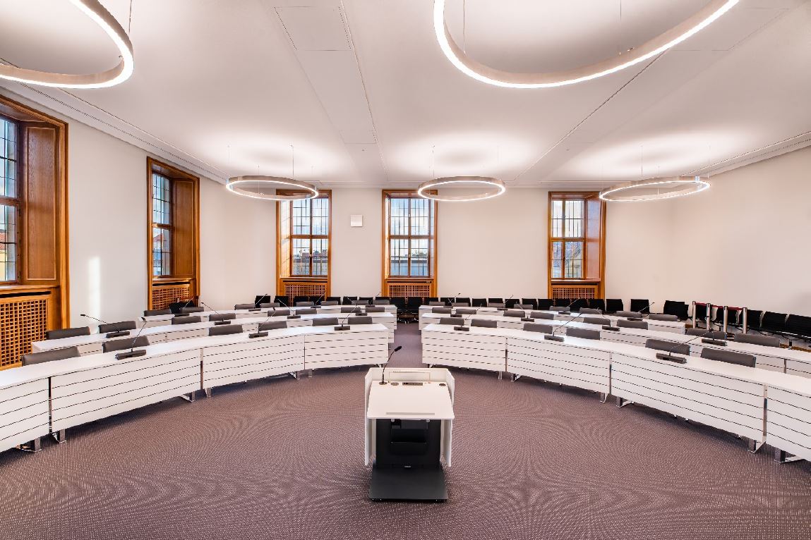 Ebenso eine nach aktuellen Standards installierte Sicherheits- und Brandschutztechnik (Schottungen sowie Verkleidungen von Installationsschächten und Lüftungskanälen), das Sichern einer ausreichenden Anzahl von Stromanschlüssen für die Anbringung zeitgemäßer Medientechnik und natürlich die technische Basisausstattung selbst, wie zum Beispiel Mikrofone und versenkbare Displays, die in die Tische eingelassen werden konnten.