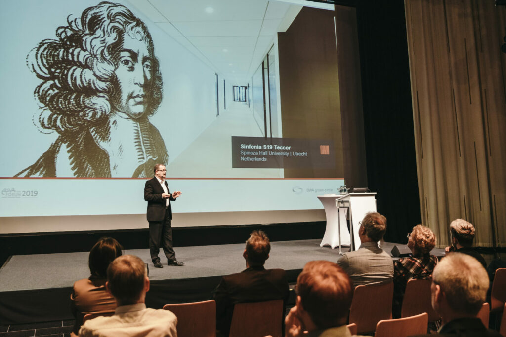 André Overbeck, Dipl.-Ingenieur (TU) OWAconsult, stellt die nachhaltigen OWA Systemlösungen OWActive Mineralklimadecke, Next Generation Humancare und OWA green circle beim BIG Zukunftsforum in Berlin vor.
