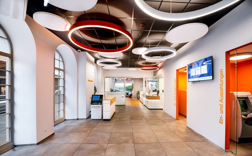 Der neu gestaltete Kundenbereich der Volksbank mit Servicezonen und Lounge lädt einerseits zum Verweilen ein, andererseits haben 3X Banktechnik Bereiche mit hoher Diskretion geschaffen, wie Nischen mit den Ein- und Auszahlungsautomaten oder separate Beratungszimmer und sogenannte Projekträume. „Beste Leistung und beste Beratung sind unser Anspruch. Das gilt auch für unsere neu gestalteten Räume“, betont Martin Szeja, Regionaldirektor der Volksbank Kurpfalz eG, den Qualitätsanspruch an die Baumaßnahmen. Durch den Umbau entstand auch ein neuer, flexibel nutzbarer Veranstaltungsbereich, der von einer großen pyramidenförmigen Bestands-Dachkuppel belichtet wird. Die Fläche wird etwa für Hausmessen oder Informationsabende genutzt. „Unsere flexibel gestaltbare ‚Pyramidenfläche‘ im hinteren Teil der Filiale ist ein lebendiger Ort, um sich zu treffen. Hier möchten wir uns mit den Menschen austauschen, auch mal abseits von finanziellen Themen“, so Michael Hoffmann, Vorstandsmitglied der Volksbank Kurpfalz eG