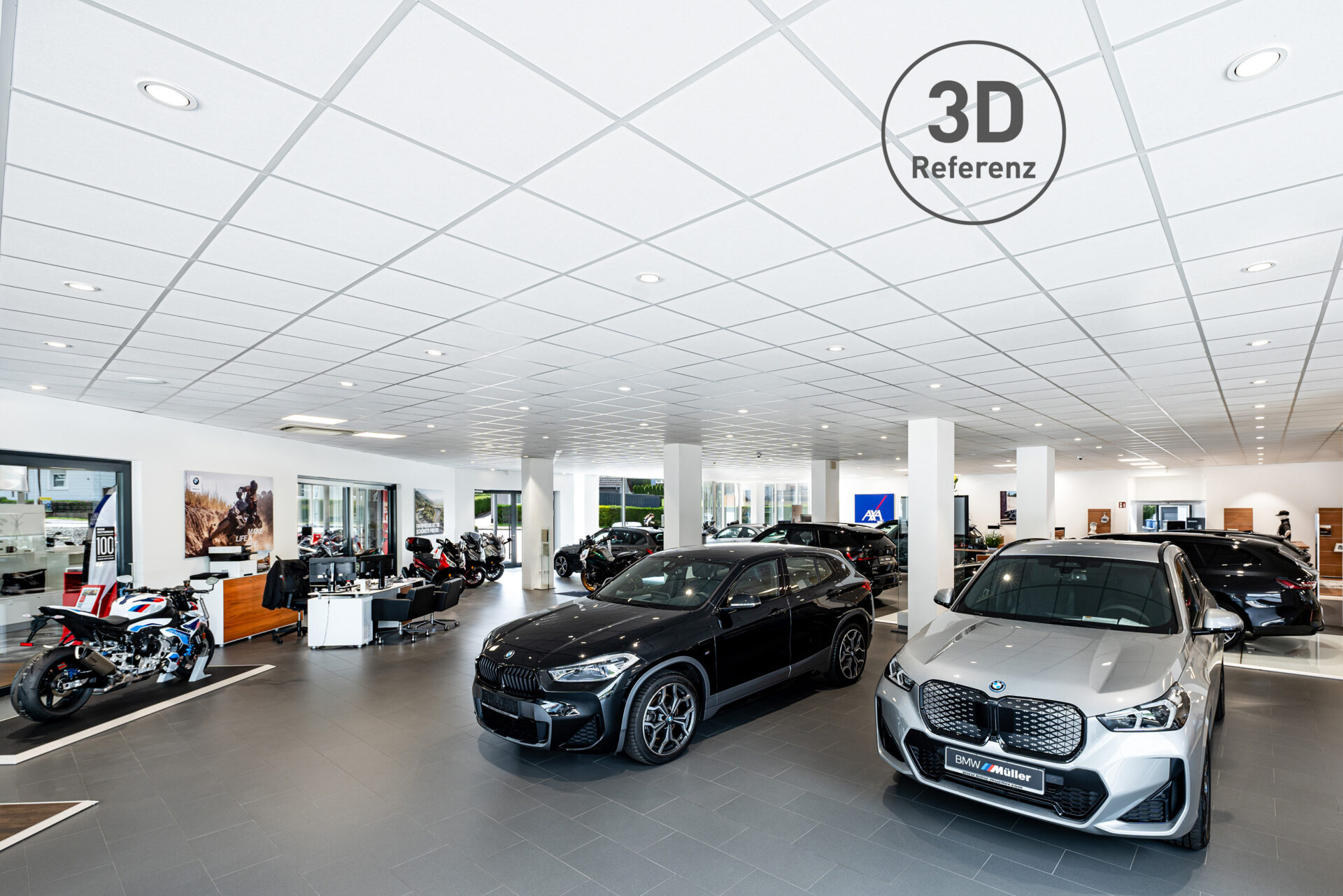 Die Verkaufsräume des BMW-Händlers Müller in Buchen-Hettingen sind ideal für die individuelle Beratung ausgestattet. Für eine optimale Sprachverständlichkeit sorgt die vlieskaschierte Mineraldecke Sinfonia. Dank der leistungsstarken Akustik im Raum wird die Wohlfühlatmosphäre von Kunden sowie Mitarbeitenden signifikant gesteigert. Das puristische Design des Deckensystems bildet den perfekten Rahmen für die Präsentation der dynamischen BMW-Modelle.