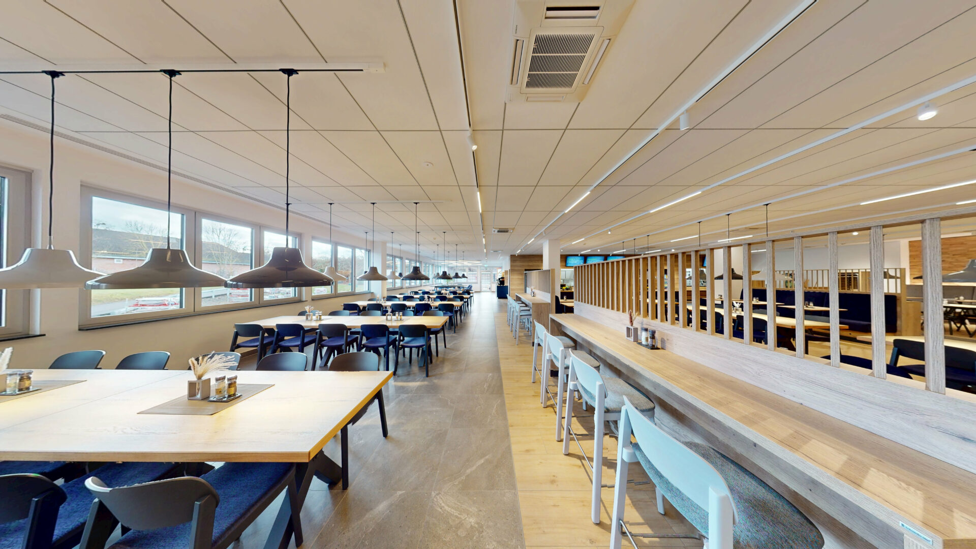 Das Betriebsrestaurant des Türsystemherstellers BODE – Die Tür GmbH in Kassel lässt sich dank OWA 3D-Matterport Projekt räumlich erleben. Die Mineralplatte Sinfonia im System S 15b sorgt in Pausenzeiten für eine angenehme Raumakustik und mehr Wohlbefinden.
