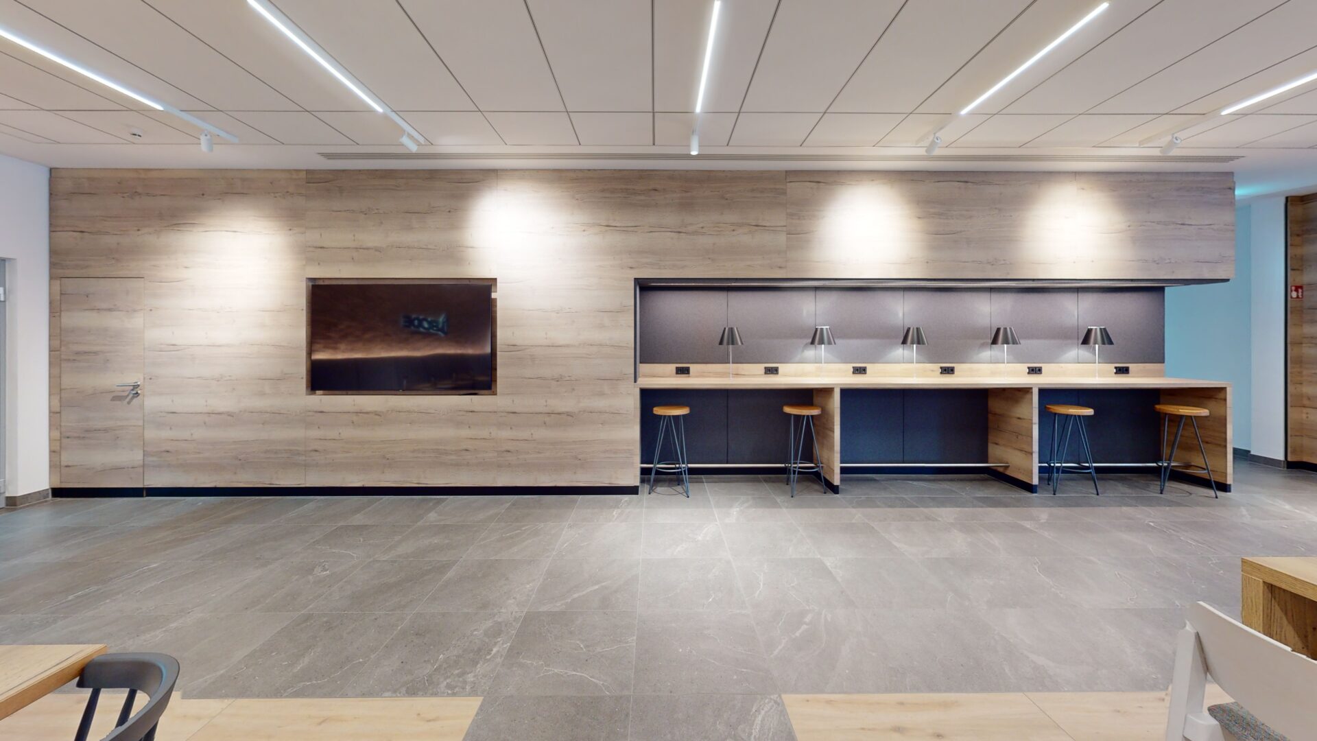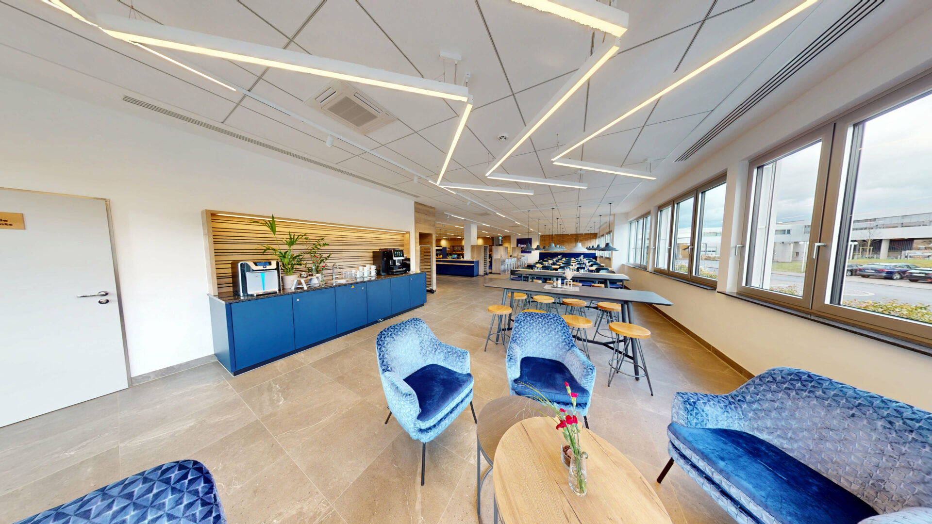 Das Betriebsrestaurant des Türsystemherstellers BODE – Die Tür GmbH in Kassel lässt sich dank OWA 3D-Matterport Projekt räumlich erleben. Die Mineralplatte Sinfonia im System S 15b sorgt in Pausenzeiten für eine angenehme Raumakustik und mehr Wohlbefinden.