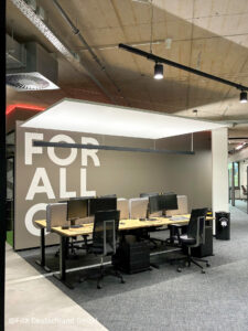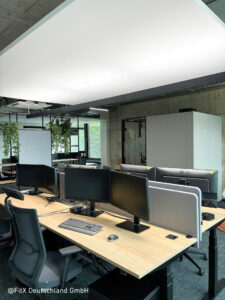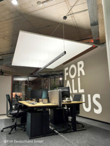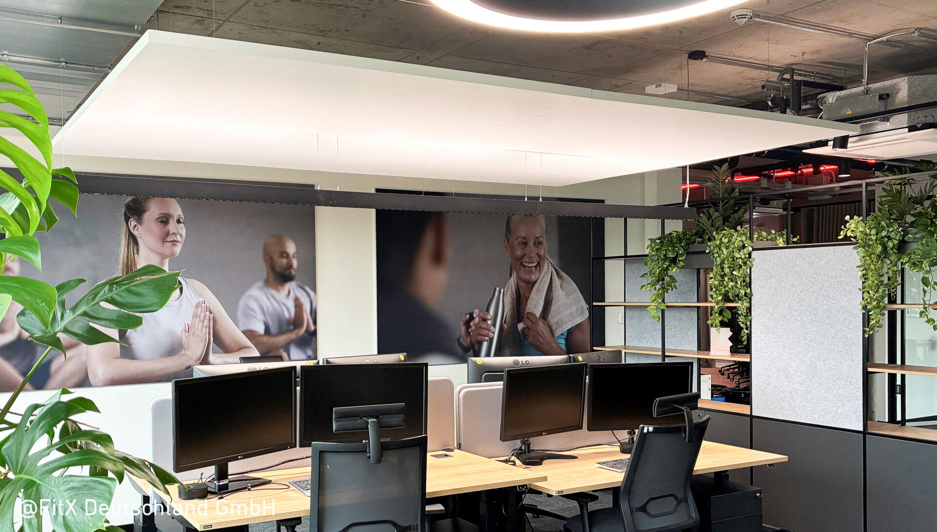 In dem Essener Headquarter der FitX Fitnessstudios sorgen OWA-Deckensegel Selecta plus und Selecta grande für akustische Höchstleistungen. Diese A-Absorber stellen sich in der offenen Bürolandschaft als echte Teamplayer dar: Sie sind formstark, sehr flexibel einsetzbar und überzeugen mit hoher akustischer Wirksamkeit. Damit unterstützt die Raumakustik eine gezielte Kräftekonzentration – bereits im Büro.