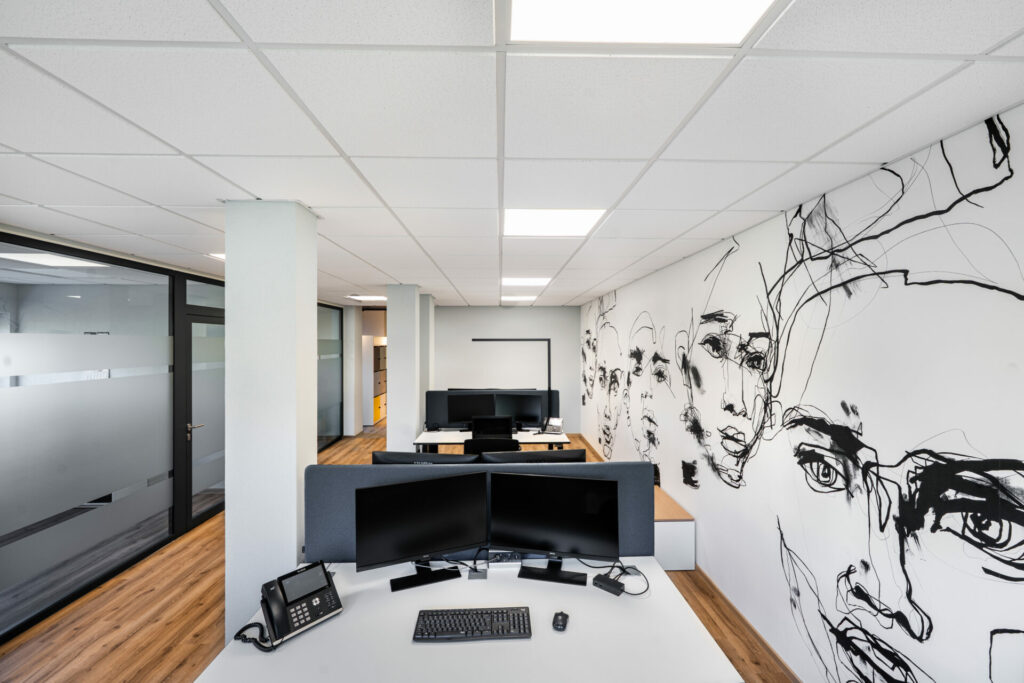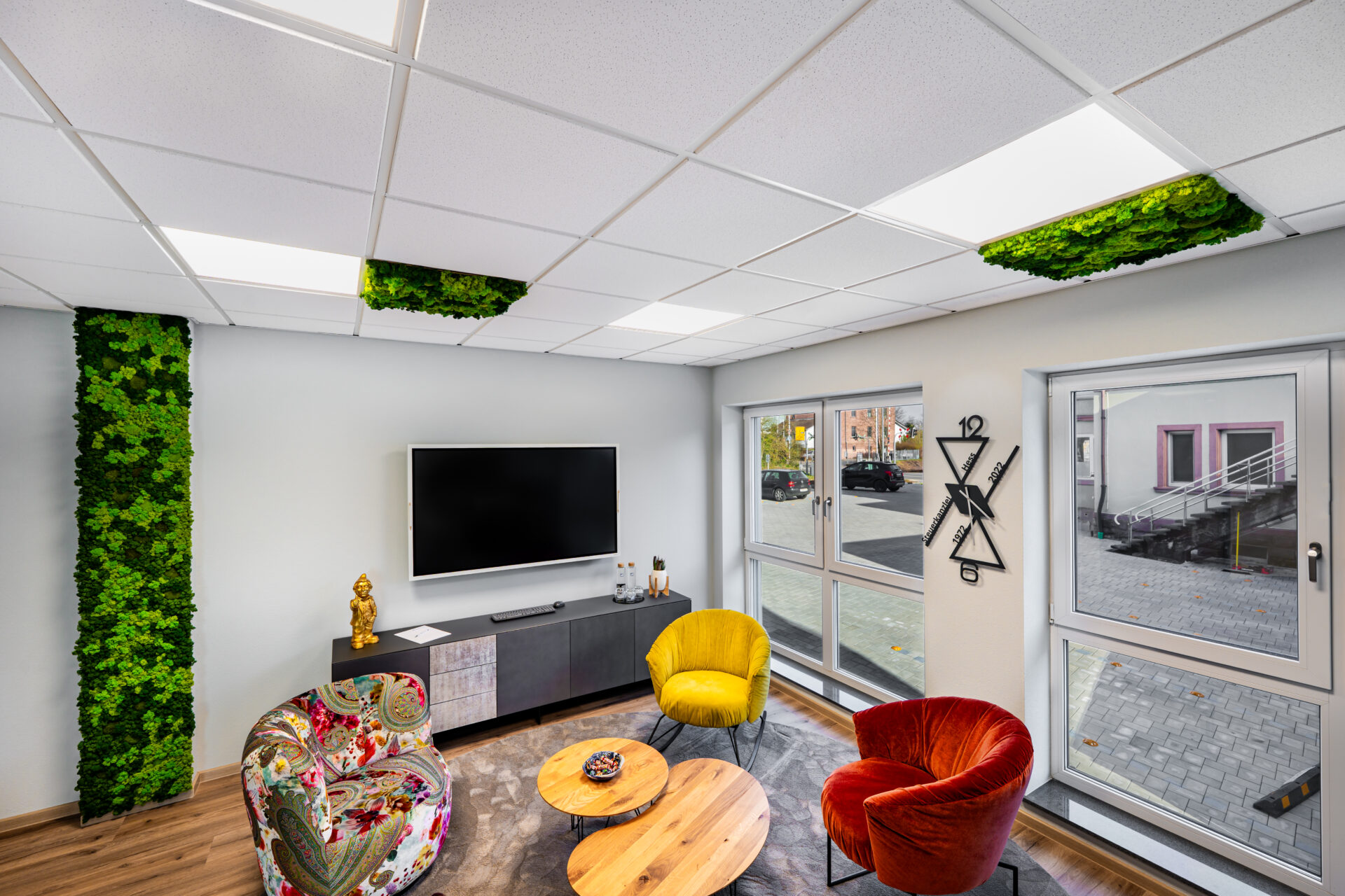 Für eine effektive Schallabsorption sorgt in diesem Falle die Mineraldecke Finetta im System S 3a. Ergänzend fügt sich die verbaute Lifetime Plus LED harmonisch in das Gesamtbild ein und sorgt für eine gleichmäßige, arbeitsstättentaugliche Ausleuchtung.