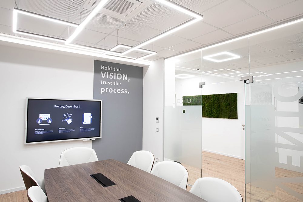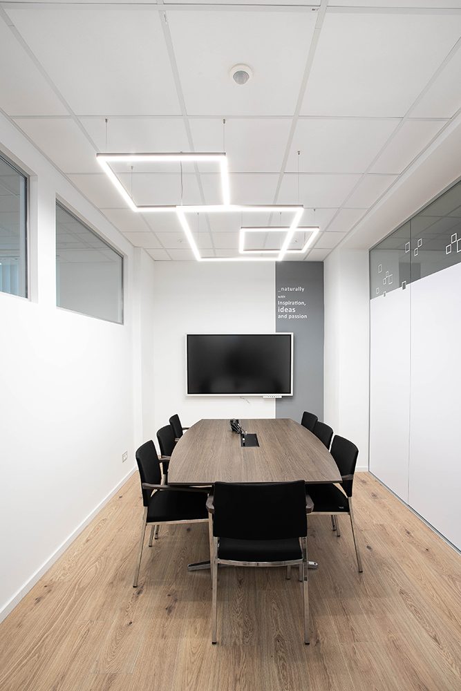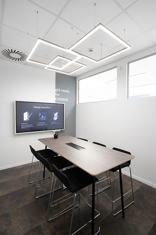 „Unser Ziel war eine saubere Ausrasterung der Decke, damit diese raumübergreifend durchlaufen kann“, erzählen die Trockenbaumeister. „Eine weitere Herausforderung war die Gestaltung und Planung des Lichts in der Rasterdecke und im Randfries.“ Wiederkehrendes Element im Deckenspiegel sind quadratische LED-Einbau- und Pendelleuchten, die – passend zum Tätigkeitsbereich von AHT – an Eiswürfel erinnern. Auch im Corporate Design von AHT ist das Quadrat ein präsentes Signet. Ergänzend zu den „Eiswürfel-Leuchten“ setzen die OWA Luminosonic-Leuchten im Foyer und in den Fluren Lichtakzente. Die Leuchten lassen sich leicht in das sichtbare System S 3 von OWA einlegen und umrahmen hellstrahlend die eingesetzte Mineralplatte. So bleibt auch die volle Schallabsorptionswirkung der Decke erhalten.