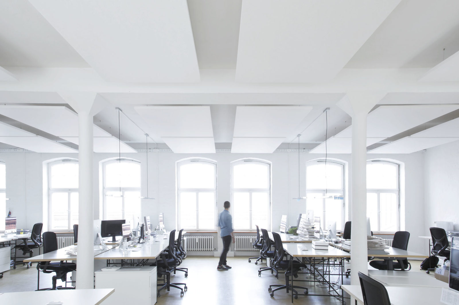 Combining sophisticated shape awareness with demanding requirements for the acoustics of the work environment, Selecta grande are ceiling canopies made of fleece-covered mineral tiles. A performance ratio of 100% (αw = 1.00) makes them powerful absorbers and the additional absorption on the reverse side delivers better results than can be achieved with non-perforated ceilings. The single suspension with intentional gaps to allow views of the ceiling therefore produces a noticeable improvement in room acoustics. Discover further exciting perspectives of this reference project in the following film.