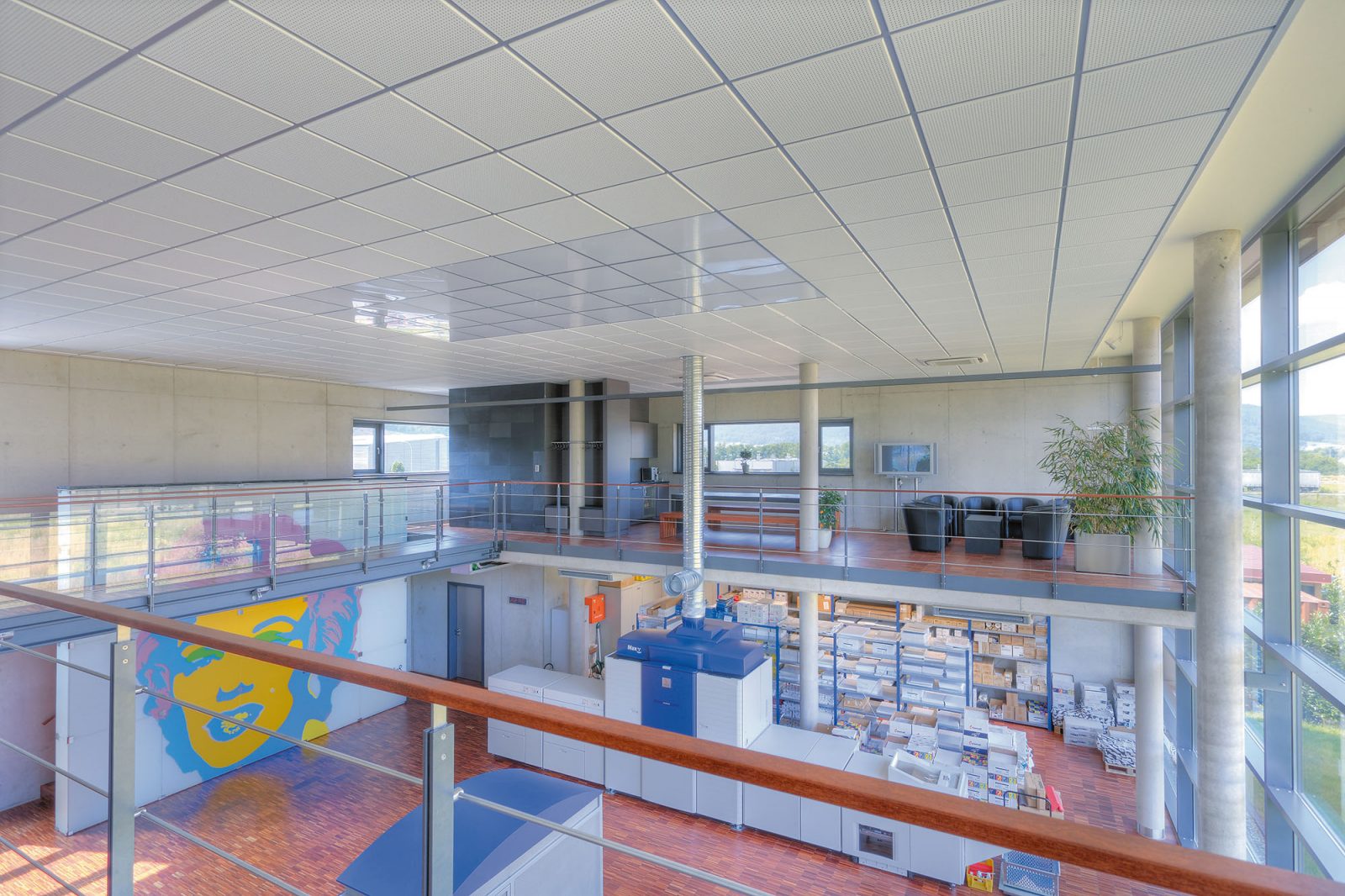 ‘Druck-Werk’ is a synonym for the building and the events that take place inside it. Making one building home to the Druck-Werk printing plant and the Mediadesign advertising agency facilitates smooth processes and the production of high-quality products. The design Regularly Perforated was installed in System S 3a. The aluminium-coloured exposed grid suspension system makes the ceiling’s appearance even more elegant. Discover further exciting perspectives of this reference project in the following film.