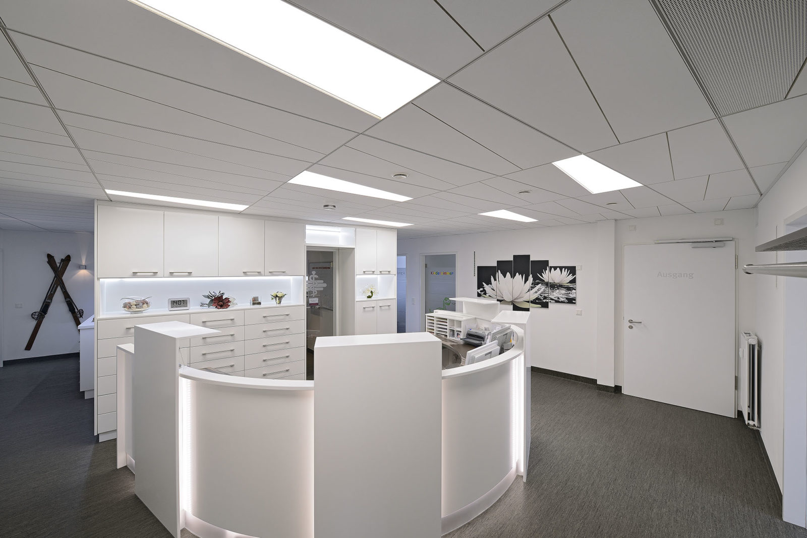 Los techos acústicos en recintos de ángulos irregulares son con frecuencia un reto estético de difícil solución. Salvo que en la configuración del techo se renuncie al patrón habitual de tablero de ajedrez, como se planeó y ejecutó en las salas de recepción de un consultorio con paneles de techo trapezoidales y las luminarias incorporadas adecuadas. Descubra más perspectivas emocionantes de este proyecto de referencia en el siguiente clip de película.