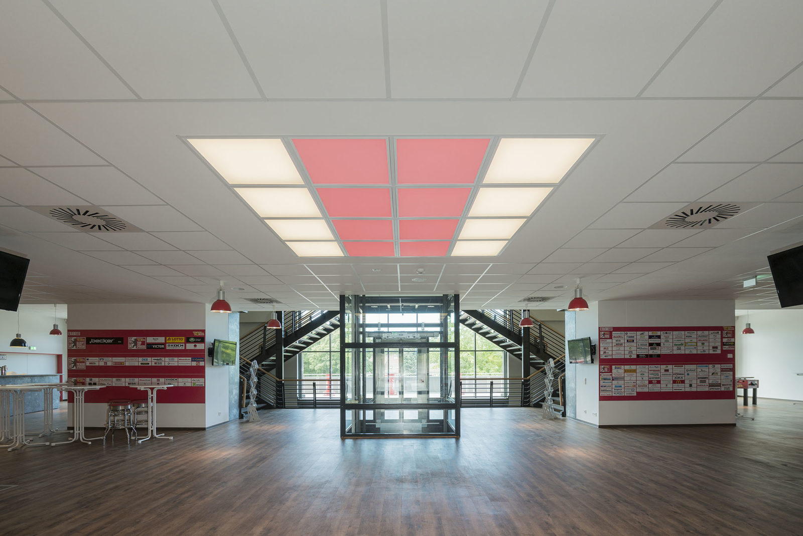 El vestíbulo del área de eventos y VIP fue configurado con un panel luminoso representativo de los colores rojo y blanco del club e instalado en el techo acústico Sinfonia del Sistema S 3. Descubra más perspectivas emocionantes de este proyecto de referencia en el siguiente clip de película.