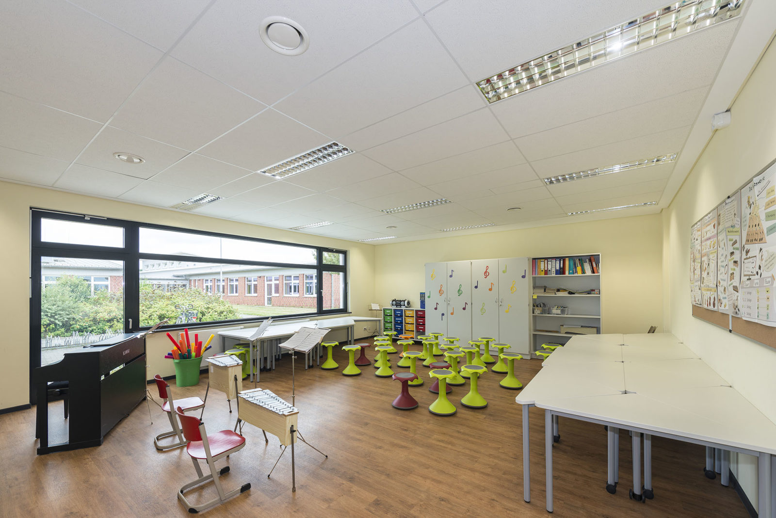 L’idea che i soffitti acustici conferiscano ai diversi locali della scuola di Meinersen da un lato personalità e dall’altro però li fanno sembrare una superficie unica, prosegue fino ai pannelli minerali. L’aspetto in comune è la superficie liscia e luminosa, in grado di riflettere la luce che ne sottolinea il “grado di parentela” e ad un’occhiata fugace danno persino l’impressione che si tratti ovunque degli stessi pannelli.