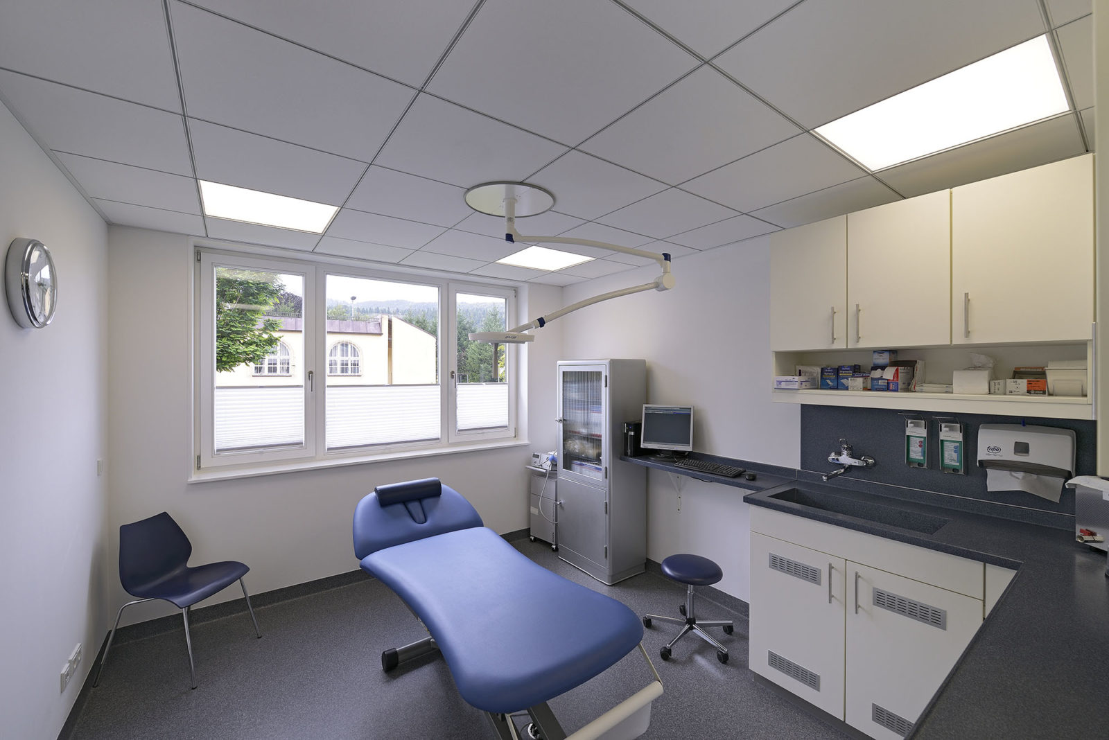Gli ambulatori si differenziano dell’ingresso/area accettazione. Qui i classici pannelli quadrati del controsoffitto nel sistema S 15b OWAline e nel design Sinfonia si adattano bene alla pianta rettangolare, sottolineando l’aspetto tranquillo e neutro della stanza.