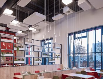 Lastly, Corpus elements were installed as wall absorbers, contributing to the acoustical properties of the dining hall and creating a perfect transition between wall and ceiling.