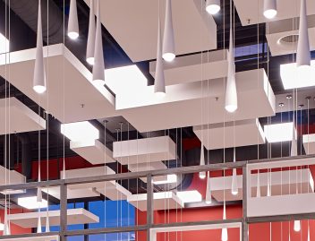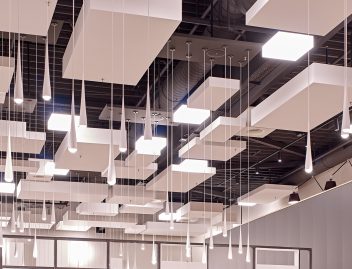 OWA’s “Corpus” elements, designed by world-renowned architect and designer Hadi Teherani, is a perfect example of how acoustical ceiling canopies can be transformative stylistic elements for successful interior design. These highly absorptive cubic elements, designed by OWA in the Odenwald Mountains of Germany, have been the recipient of several highly regarded global design awards, and with good reason. Beckhoff Automation GmbH & Co. KG, a manufacturer of automation technology based in Verl in Eastern Westphalia, Germany, has incorporated these square and rectangular elements, along with impressive lighting highlights, to create an area with brilliant design and even better acoustics.