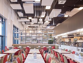 OWA’s beautiful “Corpus” acoustical ceiling canopies from the OWAconsult collection presented a perfect solution. The winner of nine design awards worldwide, Corpus was already proven as a globally innovative design system. The collection of square and rectangular modular elements, ten shapes and sizes in all, added unlimited design possibilities to the already stunning aesthetics of the Corpus system.