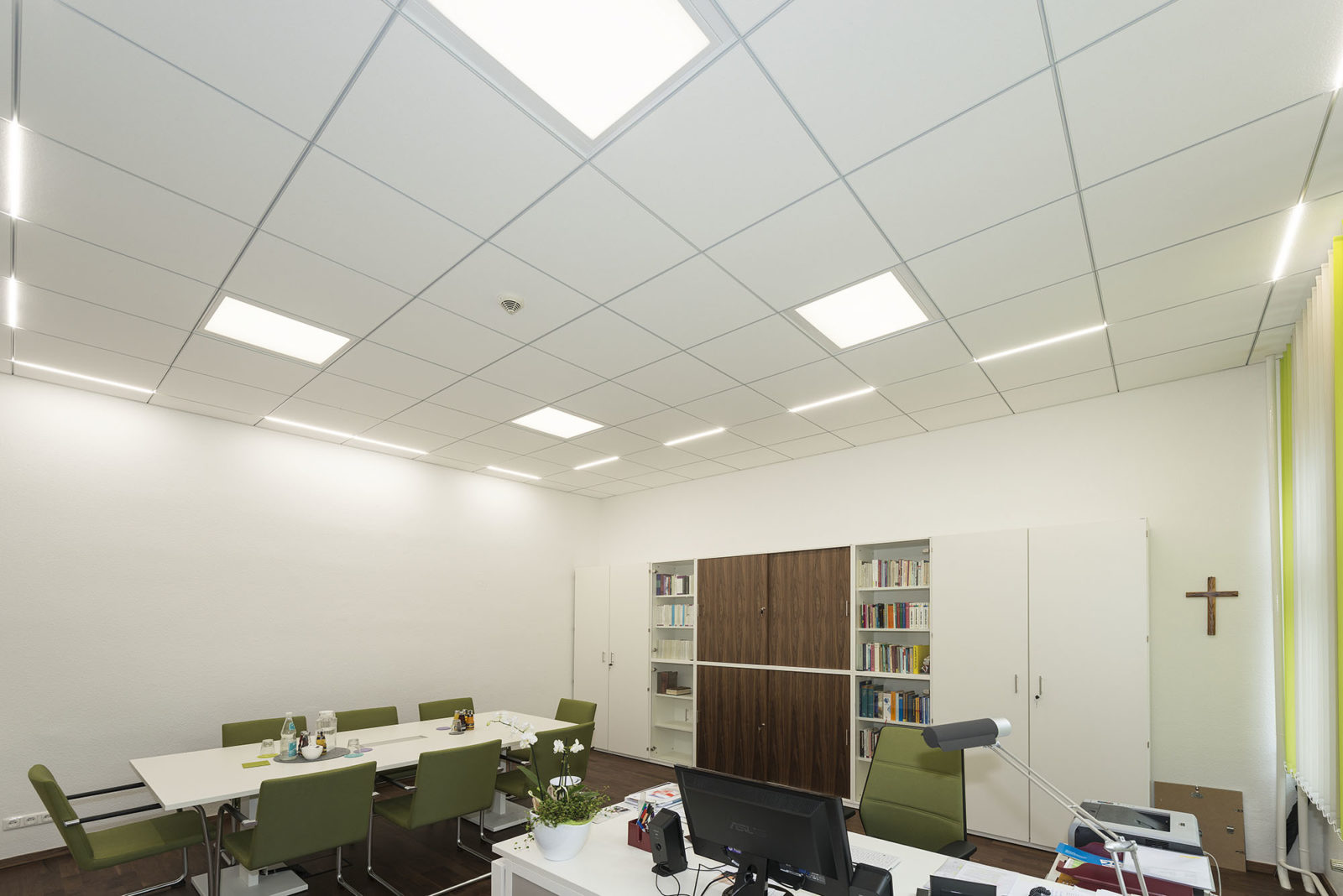 The rector’s study and anteroom at Otto-Lüpke-Haus are on the ground floor. It made sense to address the dual lighting and sound requirement with a single integrated solution based around the OWAlight LED light rails, the linear design of which allows for elegant installation into the seams of the mineral ceiling tiles. The light source is virtually invisible when switched off but a structure of light lines emerges as soon as it is switched on. The light lines can be rearranged as required for each project. Discover further exciting perspectives of this reference project in the following film.